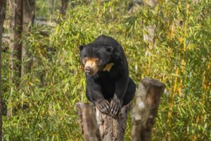 Despite their small stature, sun bears are incredibly strong. They use their muscular limbs and sharp claws to tear into trees in search of insects, while their impressively long 25cm tongues allow them to reach honey and termites hidden deep within crevices.